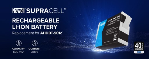 Newell SupraCell AHDBT-901c to innowacyjny zamiennik akumulatora przeznaczony do kamerek sportowych. Zastosowane w nim ogniwa i nowoczesna elektronika zadowolą nawet najbardziej wymagających użytkowników. Linia SupraCell powstała specjalnie z myślą o intensywnym użytkowaniu, a także bardzo częstym ładowaniu i rozładowywaniu. Prezentowane ogniwo oferuje 1730 mAh pojemności. Dzięki odporności na skrajne temperatury, z powodzeniem wykorzystasz je podczas pracy nad filmami realizowanymi zarówno w zimowym krajobrazie, a także podczas upalnych dni. Dzięki 40-miesięcznej gwarancji rewolucyjny akumulator Newell SupraCell będzie towarzyszył Ci przez długie lata, a w razie jakiejkolwiek awarii zostanie szybko wymienione przez producenta na nowy!