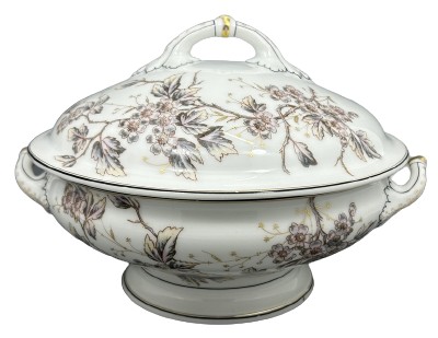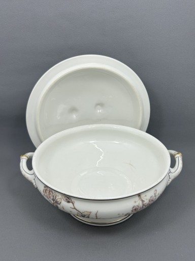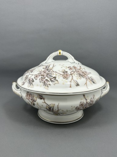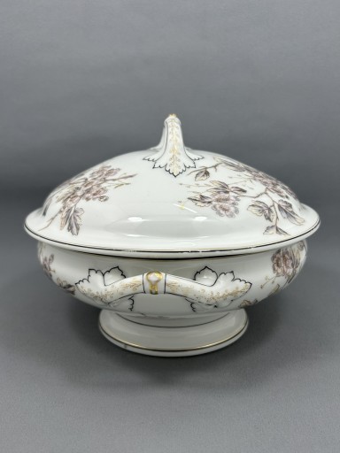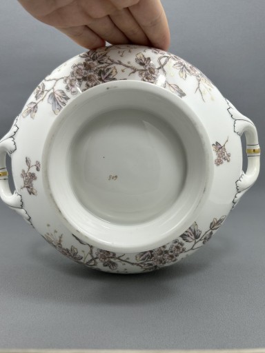 Wykonana z porcelany, ślicznie zdobiona kwiatami i złoceniami.