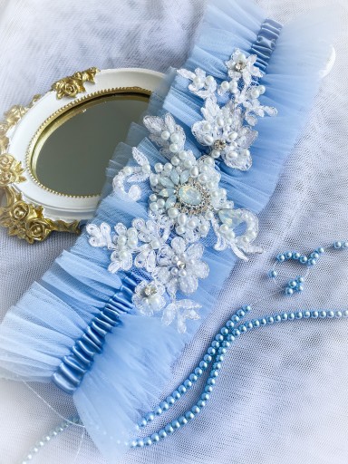 Aby zamówić taką podwiązkę wyszywaną dodatkowymi koralikami np niebieskimi i kamieniami należy wpisać to w wiadomości
