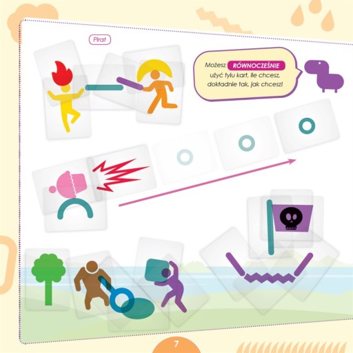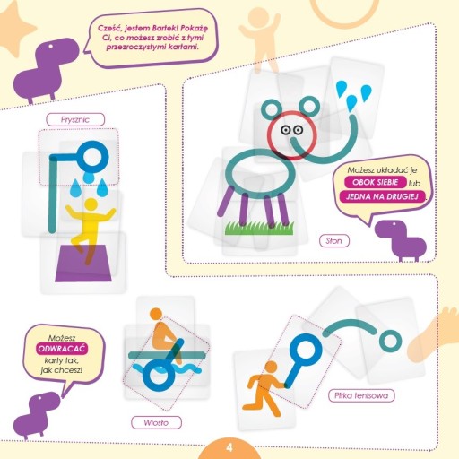 2. Aby przekazać wybrane słowo, będziemy korzystali z przezroczystych kart z grafikami. Zawierają one proste, kolorowe symbole, które musimy połączyć w taki sposób, by pozostali gracze domyślili się, o co nam chodzi. Karty możemy dowolnie łączyć nakładając jedne na drugie, a także poruszając nimi.