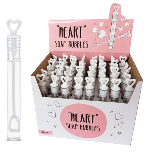 Bańki mydlane w buteleczce z zatyczką w kształcie serca. Idealnie nadają się jako upominek dla gości, gadżet do sesji zdjęciowej lub drobny prezent dla najmłodszych.