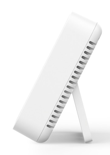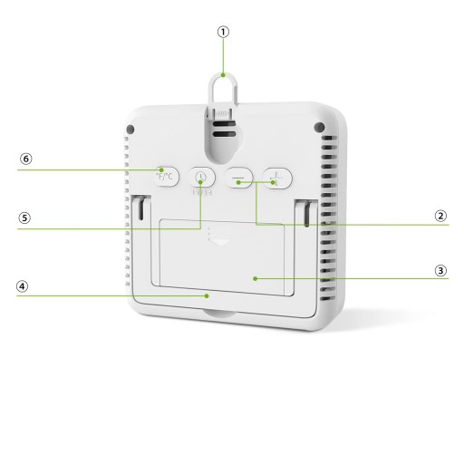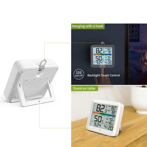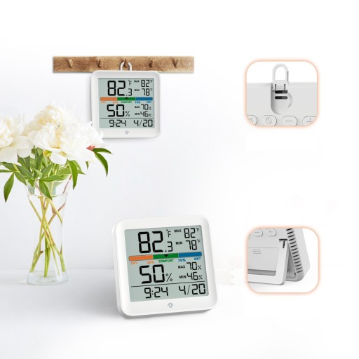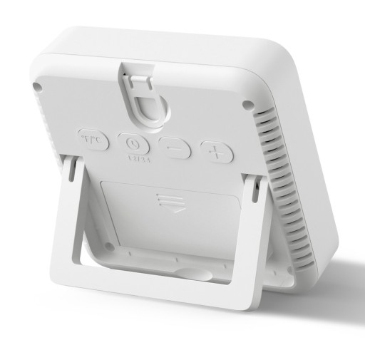 Dwie opcje montażu – z podstawką do pozycji na stole jako miernik wilgotności i hakiem do zawieszenia na ścianie jako monitor temperatury. Zasilany 2 bateriami AAA (brak w zestawie). Jednostka temperatury °F/°C do wyboru i format czasu 12H/24H do wyboru.