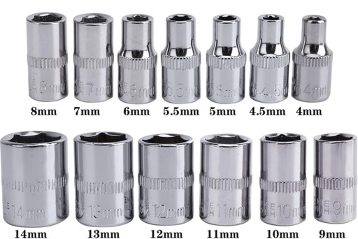 - 13 szt. Nasadki 1/4'': 4; 4.5; 5; 5.5; 6; 7; 8; 9; 10; 11; 12; 13; 14 mm