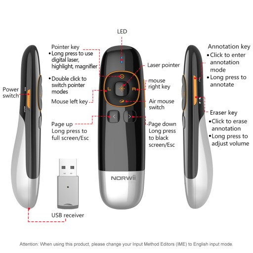 Pilot do prezentacji multimedialnych Norwii N86s pozwala poruszać kursorem na ekranie w sposób równie łatwy i precyzyjny, jak za pomocą myszki. Urządzenie działa jak magiczna różdżka – po aktywowaniu czujnika ruchu po prostu przesuwasz nim w powietrzu, a strzałka zmienia swoje położenie. Przyciski "L" oraz "R" odpowiadają lewemu i prawemu klawiszowi myszki. Norwii N86s umożliwia więc nie tylko płynną nawigację między slajdami, ale także swobodne kontrolowanie przestrzeni roboczej Twojego komputera. Pilot wspiera również funkcje gumkowania lub rysowania na ekranie. Tradycyjna myszka nie będzie Ci już potrzebna podczas wystąpień!
