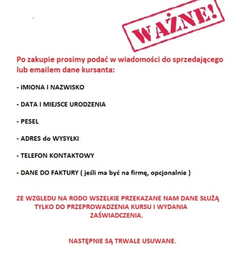 Po zakupie należy podać dane kursanta (w wiadomości do sprzedającego lub e-mailem):