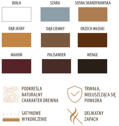 - Nadaje satynową powłokę, która chroni drewno przed wpływem czynników atmosferycznych typowych dla polskiego klimatu (mrozem, wilgocią i UV). Dzięki szybkoschnącej formule pierwsza warstwa jest sucha w dotyku już po 20 minutach, a po 2 godzinach pozostaje na malowanej powierzchni nawet podczas zmiennych warunków atmosferycznych (m.in. deszcz)