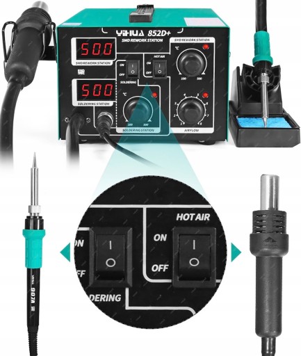 Stacja lutownicza 2w1 YIHUA 852D+ o mocy 660W wyposażona jest w hot air (gorące powietrze) oraz kolbę lutowniczą.