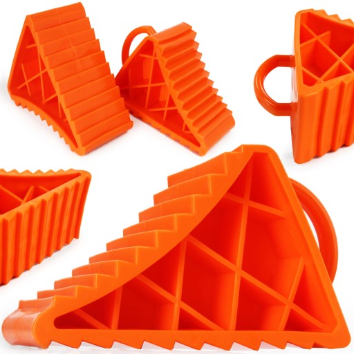 Wytrzymały zestaw klinów pod koła wykonany z wytrzymałego materiału.