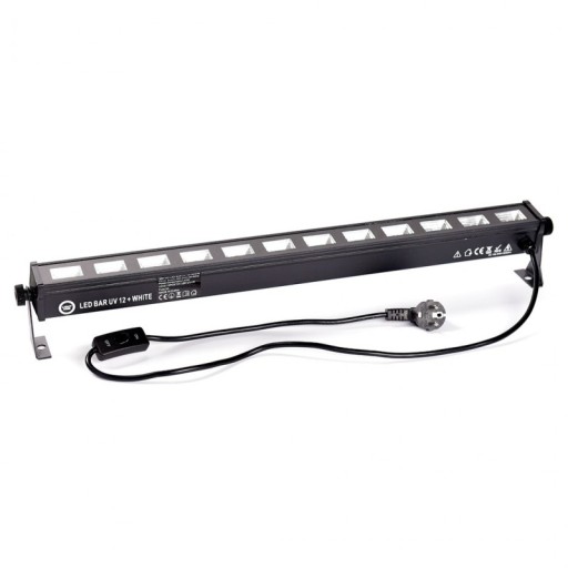 Sceniczna listwa UV+W Light4Me Led Bar UV 12 + White to profesjonalna, solidnie wykonana, a jednocześnie lekka i bardzo mobilna listwa oświetleniowa UV+W, wyposażona w 12 wydajnych, 3-watowych diod LED operujących światłem ultrafioletowym oraz białym, 2 uchwyty montażowe pozwalające na jej pracę w pozycji stojącej lub wiszącej, a także wygodny zintegrowany przewód zasilający. Sprawdza się na tanecznych parkietach, DJ party, w klubach disco, podczas prywatek, domówek, a także na jako wewnętrzne oświetlenie architektoniczne w dekoracji światłem. Może również stanowić element oprawy oświetleniowej dla zespołu lub DJ-a. Oświetlenie UV na imprezę Light4Me Led Bar UV 12 + White rewelacyjnie sprawdza się w pubach, restauracjach, klubach tanecznych i dyskotekach, gdzie promieniowanie ultrafioletowe tworzy zjawisko fluorescencji niektórych barw. To efekt UV, który z pewnością przypadnie do gustu uczestnikom każdej imprezy! Łatwa obsługa i prosty montaż Belka Light4Me Led Bar UV 12 + White jest niezwykle łatwa w montażu i bardzo prosta w obsłudze. Listwa UV+W zaczyna działać tuż po podłączeniu jej do źródła zasilania i włączeniu. Ten ultrafioletowy oświetlacz potrafi w ciekawy sposób wzbogacić dekorację światłem sali weselnych oraz miejsc, w których odbywają się imprezy okolicznościowe i przyjęcia dla dzieci, a także odmienić wystrój w kręgielniach, siłowniach i klubach fitness. Jakość Light4Me Ledowa listwa UV+W wykonana została z dbałością o detale. Ma szerokość 75 cm, a na obu jej końcach znajdują się przykręcane nóżki umożliwiające jej ustawienie pod wybranym kątem w stosunku do podłoża. Pełnią one również rolę uchwytów montażowych, dzięki którym belka LED UV+W może być instalowana na kratownicach i rampach oświetleniowych. W górnej części korpusu rozmieszczone są soczewki rozpraszające światło ultrafioletowe pod kątem 65°. Na tylnej części obudowy znajduje się bezpiecznik oraz zintegrowany z korpusem przewód zasilania o długości 100 cm.