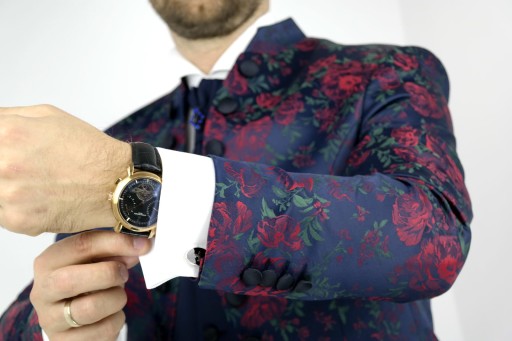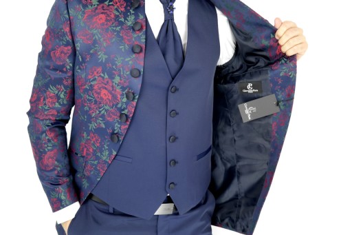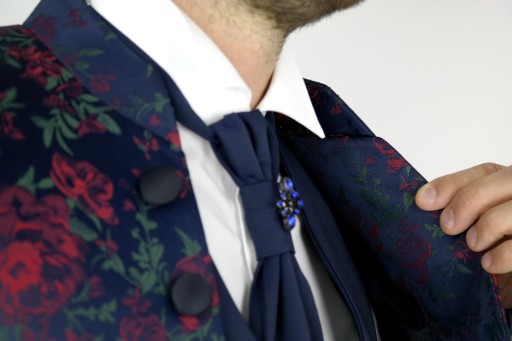 - Komplet zawiera: marynarkę, kamizelkę, krawat z efektowną przypinką oraz spodnie