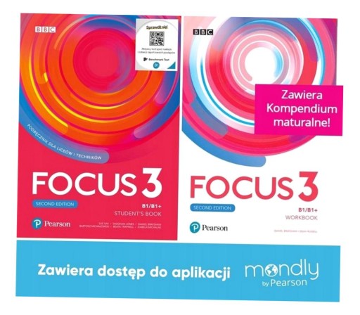 Komplet Focus Second Edition 3 podręcznik + zeszyt ćwiczeń skupia się na rozwijaniu umiejętności językowych, prawidłowej wymowie i akcencie. Celem publikacji jest realizacja założeń podstawy programowej i pomoc uczniom w nauce języka angielskiego. Zestaw uzupełnia kod dostępowy do platformy MondlyWORKS. Platforma MondlyWORKS: daje pełny dostęp premium do 41 języków za pośrednictwem aplikacji Mondly by Pearson, wykorzystuje najnowocześniejsze technologie, takie jak chatboty, rozpoznawanie mowy i AI, udostępnia dodatkowe ćwiczenia w trybie "Hands free", symulującym prawdziwe rozmowy z nativespeakerami, które rozwijają u uczniów umiejętność mówienia w obcym języku, dzięki elementom grywalizacji i dostępu do ogólnych rankingów, daje uczniom możliwość konkurowania ze znajomymi i podejmowania wyzwań, daje dostęp do modułów z ponad 40 tematami, które wzbogacą lekcje przeprowadzane w klasie, jest dostępna na wszystkich urządzeniach: komputerach, telefonach i tabletach oraz łatwo integruje się z istniejącym programem nauczania, wspiera uczniów potrzebujących dodatkowych zadań, które nie wymagają wcześniejszego przygotowania, a ich wyniki pojawiają się automatycznie w aplikacji, w prosty sposób monitoruje aktywność i postępy uczniów. Podręcznik Focus Second Edition 3 to kurs do nauki języka angielskiego dla licealistów i uczniów techników. Seria Focus Second Edition wyróżnia się różnorodnymi materiałami dydaktycznymi - również narzędziami do nauki online. Zeszyt ćwiczeń Focus Second Edition 3 uzupełnia materiał z podręcznika z tej samej serii. Intuicyjna struktura ćwiczeniówki, różnorodne ćwiczenia na gramatykę i słownictwo oraz dodatkowe komponenty umożliwiają efektywną naukę języka angielskiego. Uczniowie znajdą w ćwiczeniówce Focus Second Edition 3 arkusze pracy z filmami BBC, które wspierają osłuchanie się z językiem oraz kod dostępu do interaktywnego zeszytu ćwiczeń, który automatycznie sprawdza zamknięte zadania, udostępnia bazę nagrań audio i wideo. Ponadto uczniowie mogą skorzystać z dodatkowych ćwiczeń z zakresu gramatyki i słownictwa.