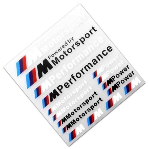 Zestaw 16 naklejek BMW M PERFORMANCE wymiary całego arkusza 120mm x 127mm