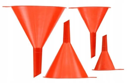 Zestaw 4 uniwersalnych lejków z tworzywa sztucznego o różnych średnicach (52, 76, 100, 120 mm). Przydatny w domu, garażu i warsztacie.