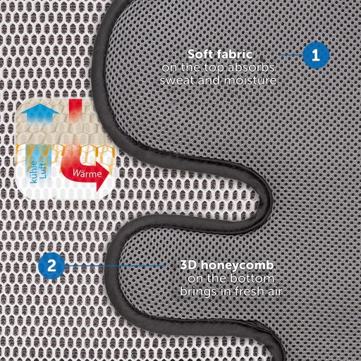 Dzięki strukturze plastra miodu 3D powstaje poduszka powietrzna pomiędzy siedziskiem a ciałem – chłodne powietrze jest doprowadzane i niezawodnie odprowadza ciepło ciała.