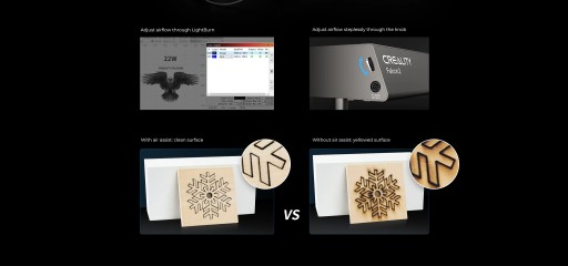 4. Pierwsze wspomaganie powietrzne: Pierwsze urządzenie wspomaganie powietrzne może nie tylko działać bezstopniowo za pomocą pokrętła, ale także inteligentnie wysyłać wielkość powietrza za pomocą oprogramowania LightBurn, aby zdmuchnąć dym i podczas procesu grawerowania, chroniczna soczewka głowicy lasera i spraw, aby ciąć było bardziej czyste i gładkie. Dzięki temu krawędziowemu przedmiotowi przetwarzanemu pozostają czyste.