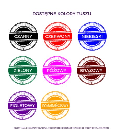 Bogata oferta kolorystyczna obudowy jak i kolorów tuszy pozwoli Państwu wybrać idealną pieczątkę.