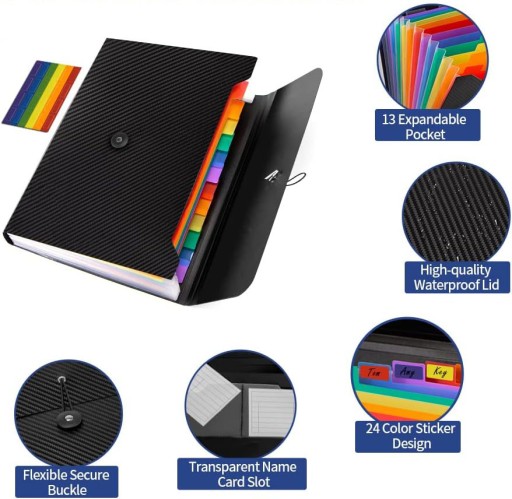 ✅ NOWOCZESNY STYL - teczka posiada wbudowane kolorowe foldery umożliwiające na oddzielenie dokumentów. Przedni schowek pozwoli na przechowywanie przedmiotów biurowych/szkolnych.