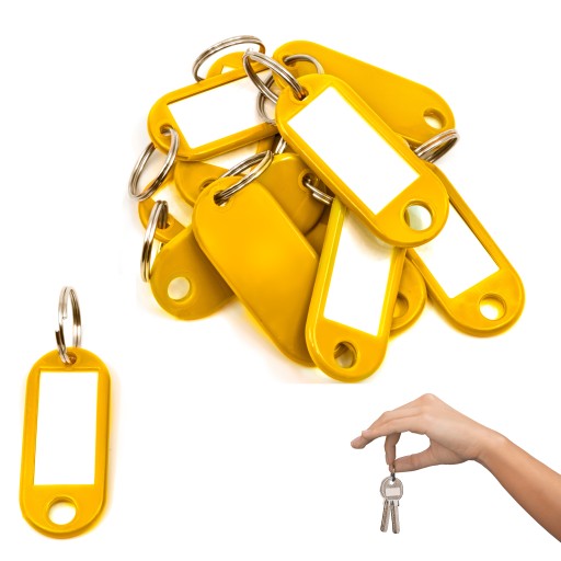 Posiadają wsuwaną karteczkę opisową do części zasadniczej kolorowej oraz kółeczko łączące je z kluczami