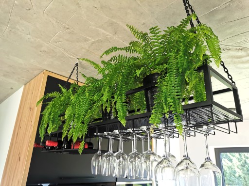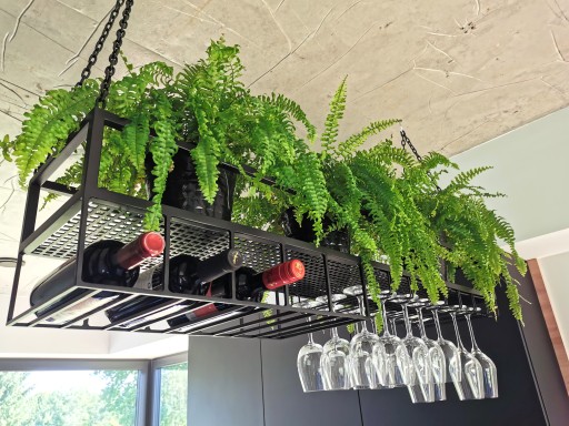 Kwietnik - półka sufitowa z uchwytami na kieliszki i butelki, doskonale sprawdzi się zarówno w kuchni, jak i salonie dodając nowoczesnego desingu pomieszczeniu. Świetnie komponuje się również w restauracji czy barze wypełniając miejsce nad barem.