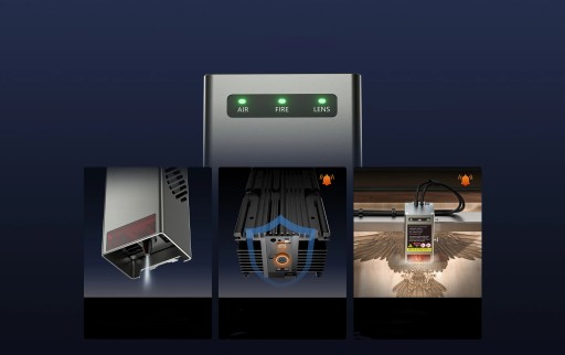 4. Pierwsze wspomaganie powietrzne: Pierwsze urządzenie wspomaganie powietrzne może nie tylko działać bezstopniowo za pomocą pokrętła, ale także inteligentnie wysyłać wielkość powietrza za pomocą oprogramowania LightBurn, aby zdmuchnąć dym i podczas procesu grawerowania, chroniczna soczewka głowicy lasera i spraw, aby ciąć było bardziej czyste i gładkie. Dzięki temu krawędziowemu przedmiotowi przetwarzanemu pozostają czyste.