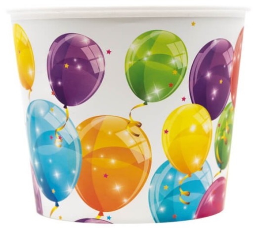 Ozdobny plastikowy pojemnik wielokrotnego użytku na popcorn czy inne słone bądź słodkie smakołyki to fantastyczny gadżet na niezapomniane urodzinowe przyjęcia, dziecięce bale oraz kinder party.
