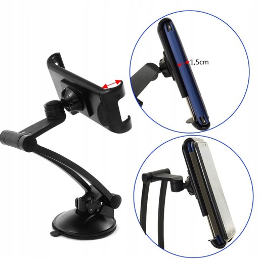 Uchwyt pasuje do tabletów od 7 cali aż do 11cali, nawigacji oraztelefonów od 4,5 cali.