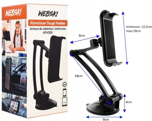 Uchwyt posiada prostą konstrukcję i nie jest skomplikowany w użyciu. Posiada wbudowaną regulację dla różnej wielkości i grubości tabletów i telefonów. Możesz obrócić uchwyt o 360stopni i ustawić go w dowolny możliwy sposób. Podstawa wyposażona jest w dużą przyssawkę, dzięki czemu możesz zamontować go gdzie chcesz i jak chcesz, co gwarantuje tobie wygodę z użytkowania. W zestawie jest kluczyk imbusowy, który pozwala nadokręcenie ramienia nieruchomo pod kątem, który potrzebujesz. Polecany do wana lub ciężarówki ze względu na swoje długie ramię.