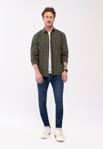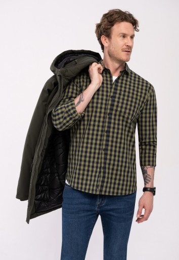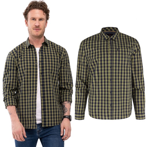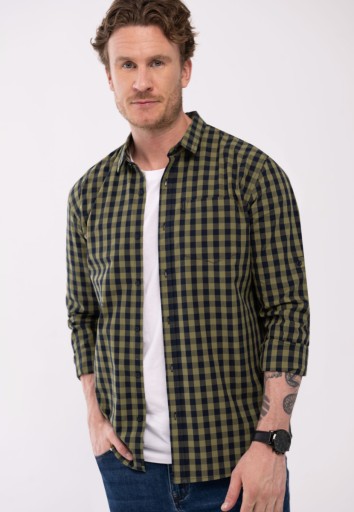 To klasyczna koszula męska w kratę o zielonym kolorze. Ma regularny krój, a więc nie jest tak mocno dopasowana do ciała. Ten klasyczny, luźniejszy fason jest troszkę dłuższy niż fason Slim Fit, a do tego szerokość w pasie i w klatce piersiowej jest zbliżona.