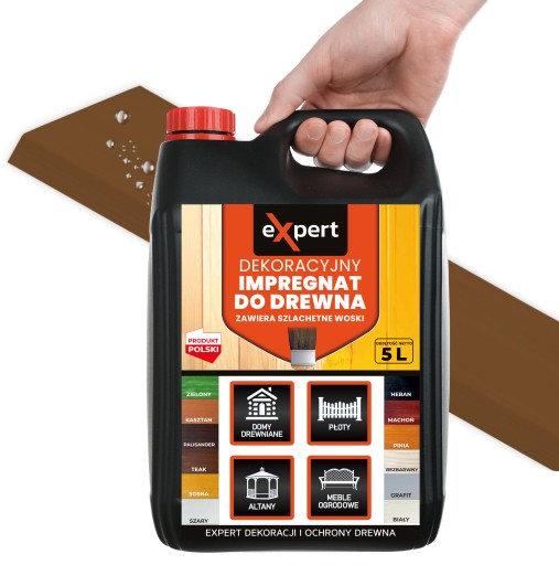 Impregnat do ochronny drewna to produkt na bazie żywicy akrylowej przeznaczony do ochrony i dekoracji drewna. Produkt zawiera najwyższej jakości naturalne woski, które odpychają wodę, dzięki czemu zwiększają trwałość i wytrzymałość drewna. Impregnat bardzo łatwo rozprowadza się po malowanej powierzchni i nie kapie. Zapewnia pełną ochronę drewna. Impregnat do ochrony i dekoracji każdego rodzaju drewna oraz materiałów drewnopodobnych. Do stosowania wewnątrz i na zewnątrz pomieszczeń.
