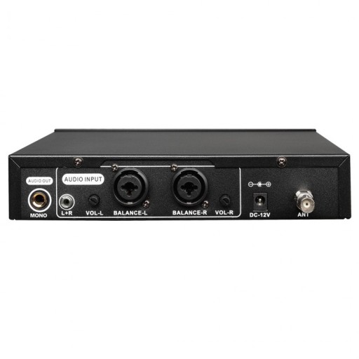 Drugą część systemu stanowi nadajnik fal radiowych o zakresie częstotliwości od 518 do 542 MHz. Na tylnej części jego obudowy znajdują się dwa wejścia typu combo – XLR/Jack dla lewego (L) i prawego (R) kanału wraz z obrotowymi potencjometrami głośności, wejście typu jack (1/4”), gniazdo do podłączenia zasilacza (w zestawie) oraz złącze antenowe BNC. W części przedniej mieści się przełącznik zasilania, gniazdo słuchawkowe z potencjometrem głośności, oraz panel sterowania wyposażony w przyciski Up, Down, Set i czytelny wyświetlacz LCD. Pokazuje on aktualne parametry systemu monitorującego dźwięk, takie jak poziom jakości sygnału, ustawienie częstotliwości pracy zestawu czy wybrany kanał przesyłania danych.