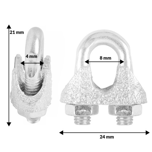 Wysokiej jakości zacisk linowy kabłąkowy do lin splotowych okrągłych. Zaciski te mogą być stosowane przy montażu linek stalowych jak i lin z włókien sztucznych. Służą do łączenia, przytrzymywania i zaciskania linek.