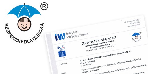 Materiał z którego uszyte są pieluszki posiada certyfikat Bezpieczny dla dziecka.