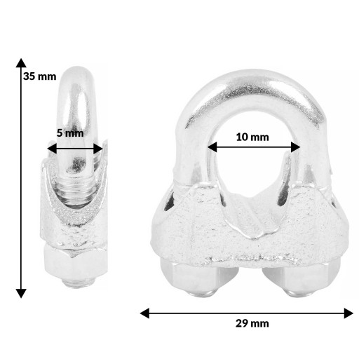 Wysokiej jakości zacisk linowy kabłąkowy do lin splotowych okrągłych. Zaciski te mogą być stosowane przy montażu linek stalowych jak i lin z włókien sztucznych. Służą do łączenia, przytrzymywania i zaciskania linek.