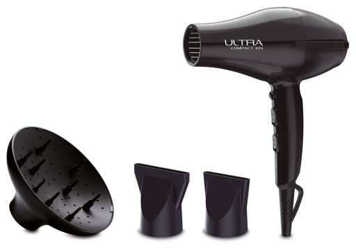 ULTRA COMPACT ION to profesjonalna suszarka do włosów z wyjątkowo niezawodnym i trwałym silnikiem o dużej mocy 2200W. Jej kompaktowa konstrukcja sprawia, że jest bardzo lekka i prosta w obsłudze. Zastosowana technologia Ion Plus wspomaga włosy w odbudowie ich molekularnej struktury: przywraca naturalne nawilżenie, zwiększa połysk i elastyczność oraz gwarantuje idealną, długotrwałą fryzurę bez elektryzowania. Dzięki zastosowaniu turmalinu do pokrycia grzałki, włosy podczas suszenia. Grzałka suszarki pokryta została turmalinem, który dzięki swojej wysokiej mocy grzewczej zapewnia szybkie, perfekcyjne schnięcie, zapobiegając jednocześnie nadmiernemu narażeniu na ciepło. W skład zestawu wchodzą 2 ultra wąskie koncentratory przepływu powietrza (4mm i 8mm) oraz dyfuzor. Jej kompaktowa konstrukcja (19 cm) i zmniejszona waga (493g) sprawiają, że jest lekka i poręczna, idealna do codziennego użytku.