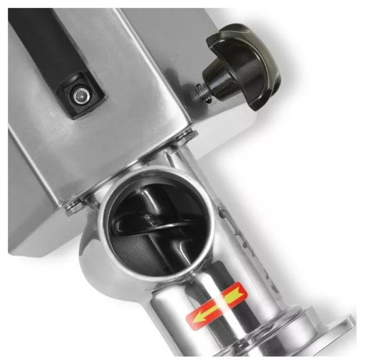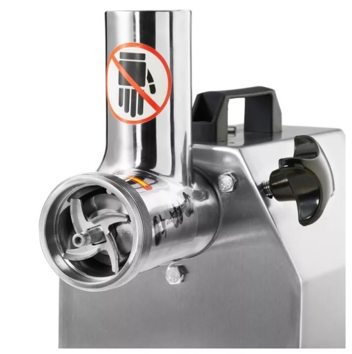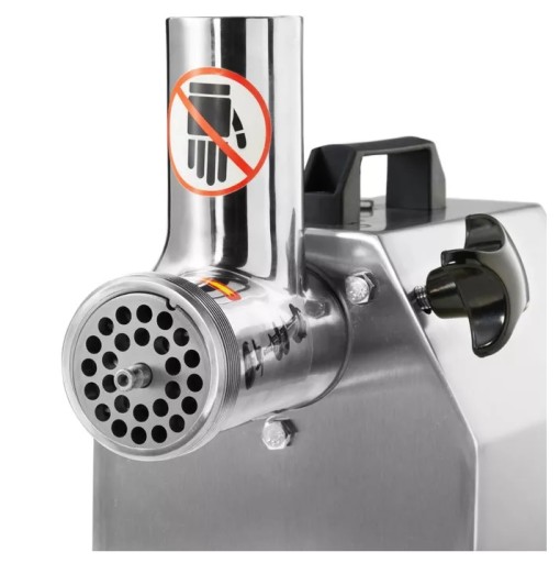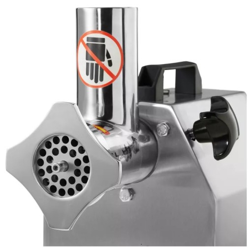 który miał kontakt z żywnością. Czyszczenie tej maszynki do mielenia mięsa jest proste. Całą część mielącą można wyjąć w celu łatwego czyszczenia. Luźne części, takie jak misa, pierścienie śrubowe, noże i tarcze można umieścić w zmywarce. Ponadto maszynka do mielenia mięsa jest wyposażona w gumowe nóżki, dzięki czemu pozostaje stabilna na miejscu podczas mielenia.