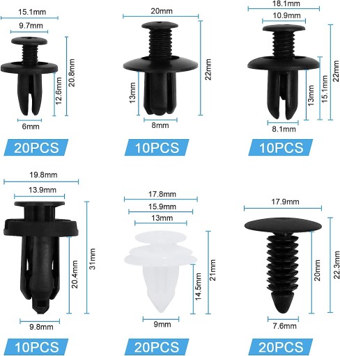 W opakowaniu znajdziesz różne wbijane klipsy samochodowe, dzięki którym nie musisz odwiedzać sklepu z częściami samochodowymi w poszukiwaniu różnych elementów mocujących. Wystarczy łatwo zdjąć oryginalny klips z karoserii i zainstalować kołki w prosty sposób, oszczędzając czas i wysiłek.