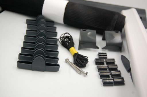 Siatka w kolorze czarnym. Górna listwa szara. Osprzęt czarny.