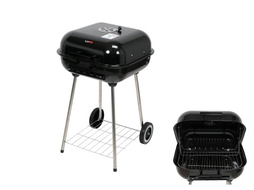 Grill wykonany został z emaliowanej stali. Dzięki wyposażeniu go w kółka oraz uchwyt grill łatwo przestawić w inne miejsce. Umieszczona między nóżkami siatkowa półka pozwala na przechowywanie akcesoriów.