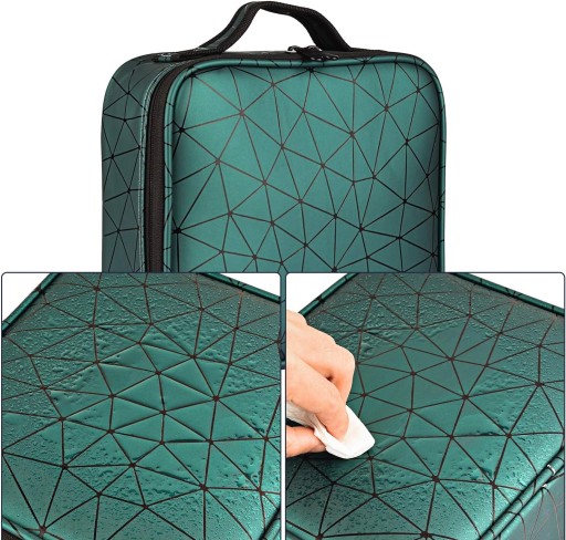 Etui posiada podwójny zamek błyskawiczny oraz rączkę, która znacznie ułatwia przechowywanie i przenoszenie. W środku głównej komory znajdują się liczne przegrody, które można przestawiać według własnych potrzeb. Na górnej klapie kuferka znajdują się przegródki na przybory do makijażu oraz kieszeń.