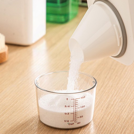 Z MIARKĄ: Pudełko do przechowywania proszku do prania z miarką i skośnymi ustami do kontrolowania ilości na użycie, nalewa się jedwabiście i czysto.