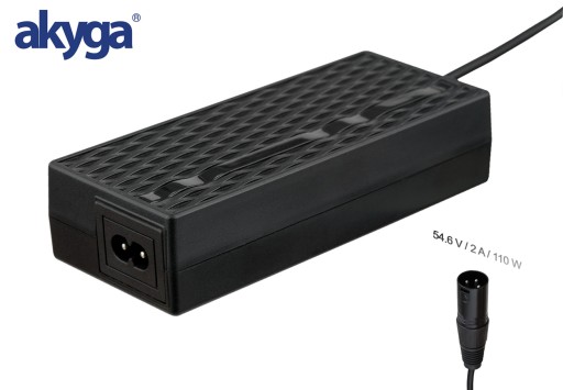 Akyga® AK-EV-04 to wysokiej jakości produkt przeznaczony do ładowania rowerów elektrycznych z maksymalną mocą 110W. Jest on dedykowany pojazdom eBike wyposażonym w pakiet akumulatorków litowo-jonowych o napięciu 48 V. Kabel wyjściowy ładowarki jest zakończony wtykiem Cannon XLR, popularnym dla tego typu pojazdów. Znaczącymi zaletami produktu jest jego wysoka, wynosząca ponad 80% sprawność, oznacza to, że mniej niż 20% pobieranej energii jest oddawane w postaci ciepła. Ładowarka jest również wyposażona w kontrolkę LED sygnalizującą o trwaniu lub ukończeniu procesu ładowania. Produkt dostępny jest w kolorze czarnym, dostarczany w ekologicznym opakowaniu Ecobox.
