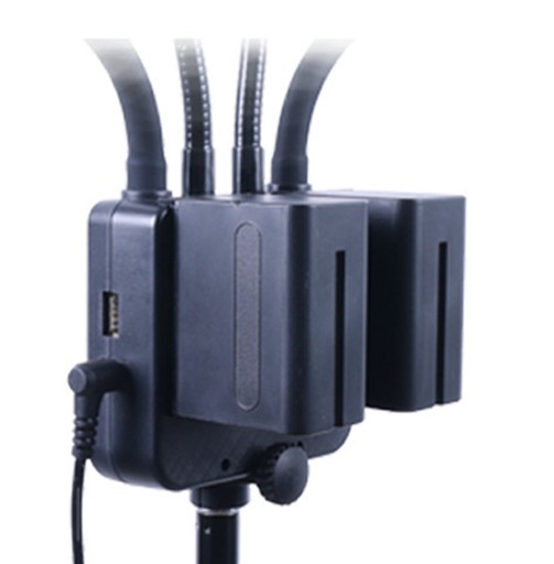 * Podwójne zasilanie: z interfejsem baterii i gniazd prądu stałego, bateria może być zasilana 2 bateriami NP-F970 (brak w zestawie) lub zasilaczem prądu elektrycznego (w zestawie), przełącznikiem do zasilania na zewnątrz lub w zasilaczu.