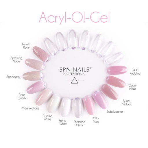 Acryl-O!-Gel dostępny jest w siedmiu przepięknych kolorach klasycznych: French White, Diamond Clear, Super Natural, Babyboomer, Cover Mask, Pink Pudding, Milky Rose oraz 4 limitowanych kolorach z mieniącymi się drobinkami: Marshmallove, Rose Quartz, Sparkling Nude i Frozen Rose.