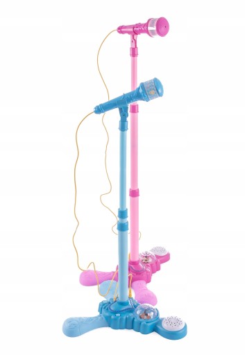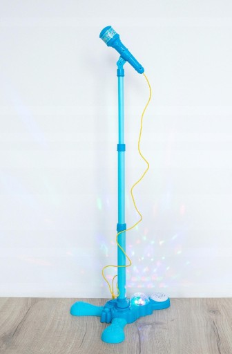 Mikrofon na statywie w pięknej kolorystyce, na pewno zachwyci każdego. Mikrofon posiada regulowany statyw o maksymalnej wysokości 100 cm. Kula obrotowa z rzutnikiem świateł na ścianę daje wspaniały efekt i nasza pociecha może się poczuć jak na prawdziwym występie. Do zestawu można podłączyć mp3, ipod, iphone.