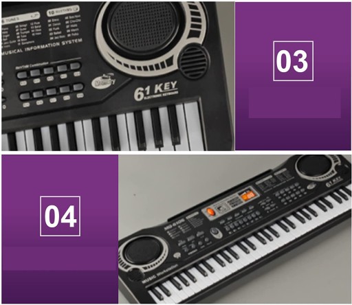 Klawiatury elektroniczne zawierają 6 utworów demonstracyjnych, 8 rodzajów muzyki perkusyjnej, 16 dźwięków i 10 rytmów, wyposażone w mikrofon o wysokiej jakości i wbudowany system głośników.