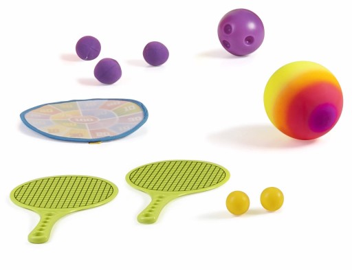 - - zestaw zawiera gry: koszykówkę, piłkę nożną, tarcze do piłek na rzep, gry rakietowe,