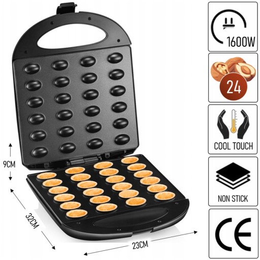 Maksymalna moc urządzenia to 1600W. Dzięki temu, jeden CYKL PIECZENIA ZAJMUJE TYLKO 2 MINUTY. Na jeden raz upieczesz, aż 24 POŁÓWKI, dzięki którym po napełnieniu masą wyjdzie 12 NADZIANYCH ORZESZKÓW. Wystarczy przygotować ciasto, krem i w kilka chwil zabłyśniesz, jako kulinarny geniusz!