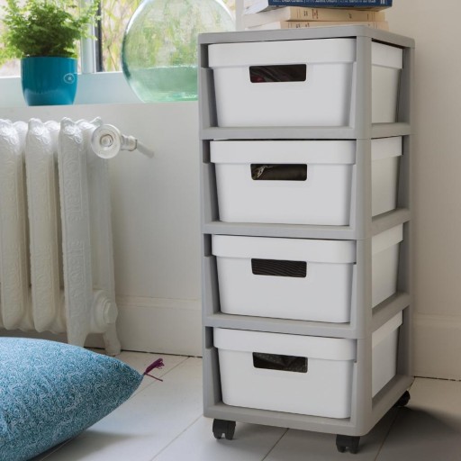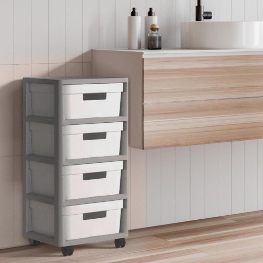 - Regał Curver Infinity w kolorze szaro-białym, z 4 szufladami będzie odpowiedni do przechowywania niezbędnych akcesoriów w łazience, sypialni, czy garderobie.