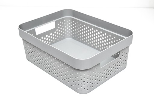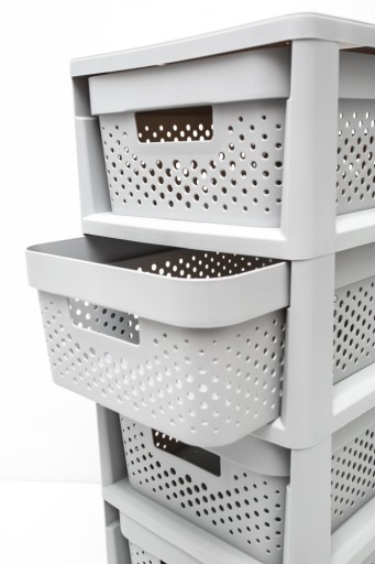 - Regał Infinity z czterama koszami ażurowymi 11l, który świetnie się prezentuje w każdym pomieszczeniu.