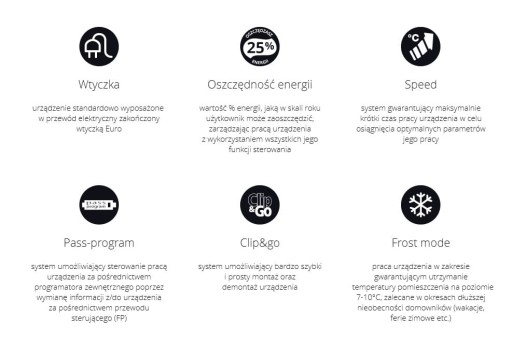 3 zakresy temperatur pracy: KOMFORT, ANTYZAMARZANIE 7°C, EKO (temperatura KOMFORT pomniejszona o 3,5°C)